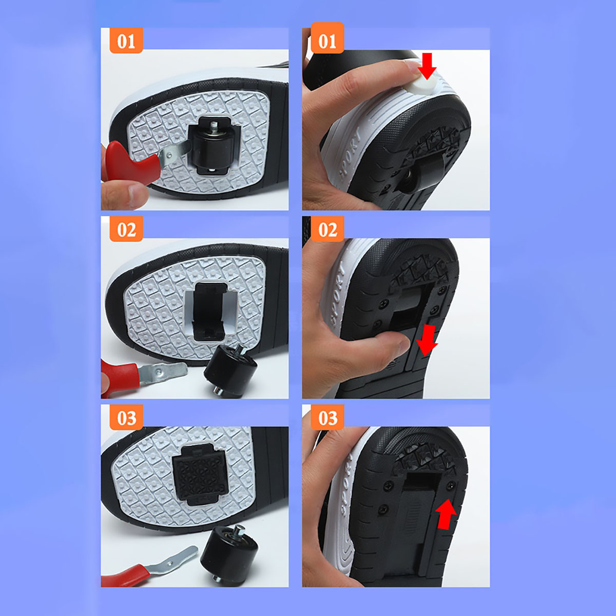 Кеды во съемными роликами 3 в 1: Могут использоваться как двухколесные ботинки, одноколесные ботинки (снимите переднее колесо и добавьте чехол) или плоские кроссовки (удерживайте кнопку за ботинками, чтобы уменьшить заднее колесо и снять переднее колесо).